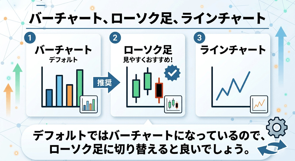 デフォルトではバーチャートになっているので、ローソク足に切り替えると良いでしょう。