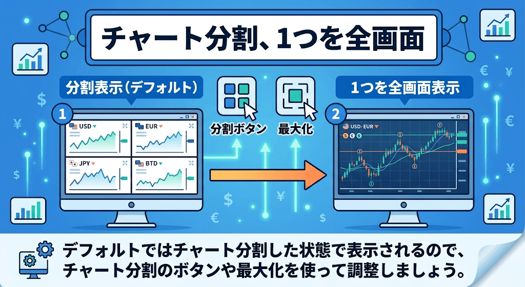 デフォルトではチャート分割した状態で表示されるので、チャート分割のボタンや最大化を使って調整しましょう。