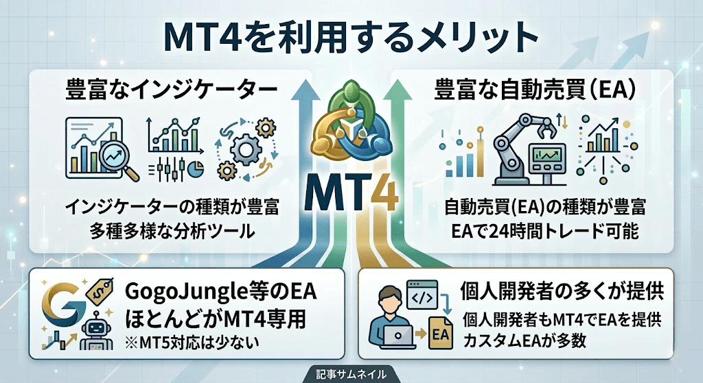 MT4を利用するメリットは「インジケーター」や「自動売買」の種類が豊富というところです。
