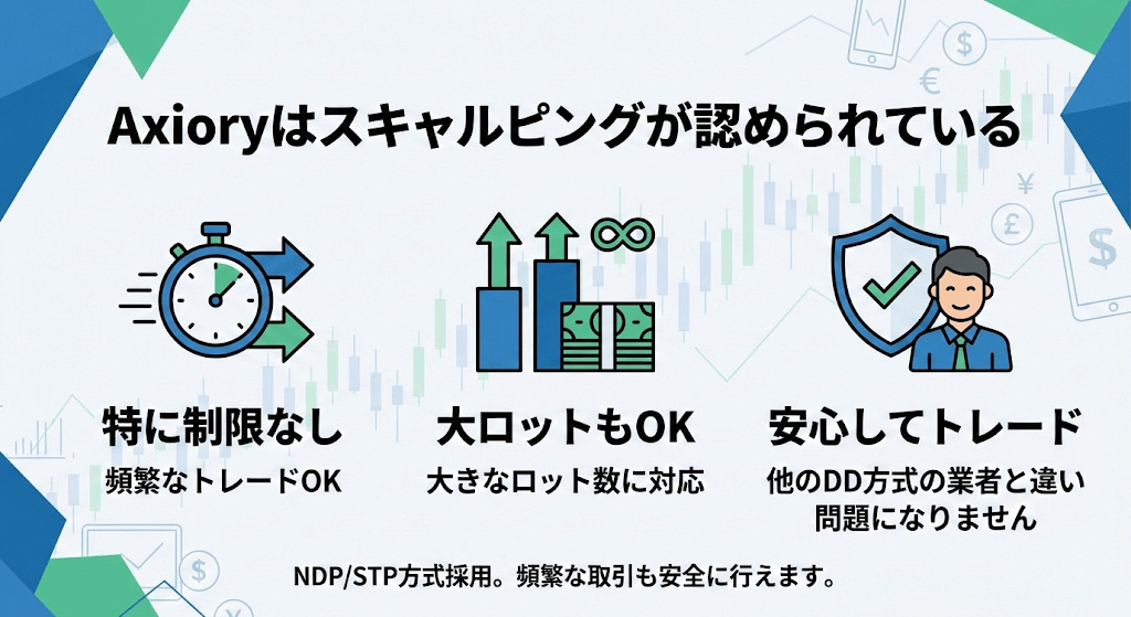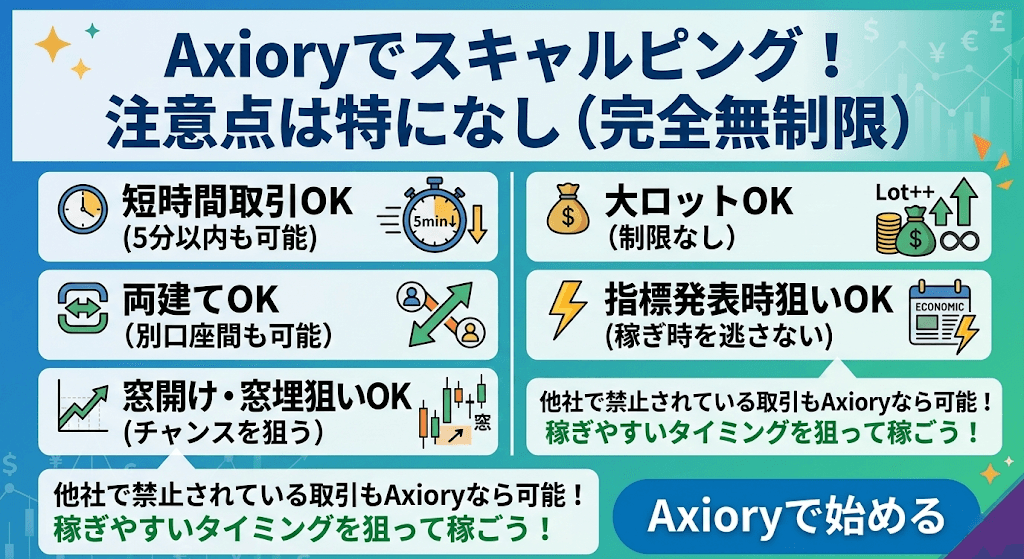 Axioryでスキャルピングをする時の注意点は特になく、無制限で取引することができます。