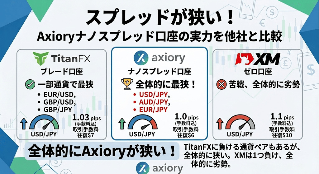 TitanFXに負けている通貨ペアもありますが、Axioryは全体的に狭いスプレッドとなっています。