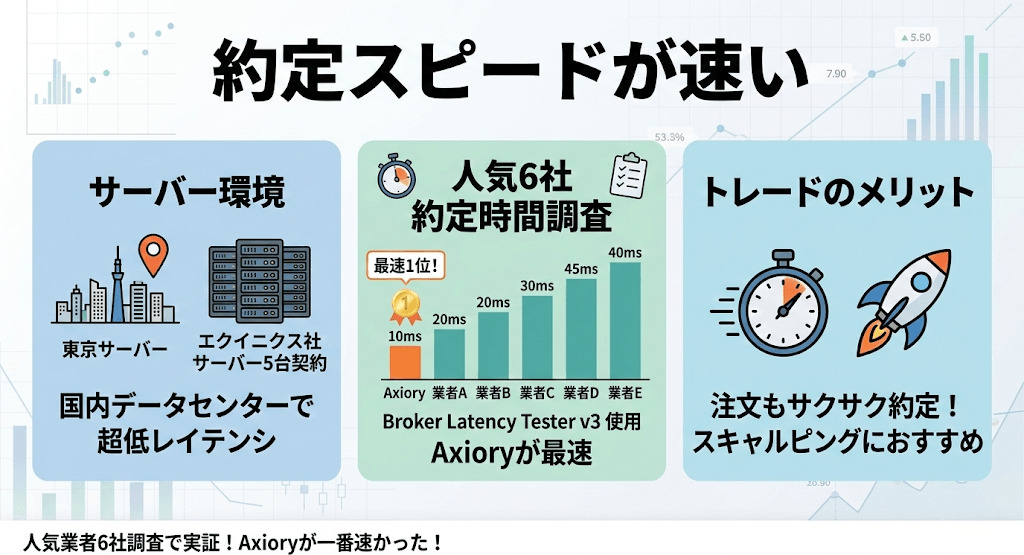 Axioryのサーバーは東京にあり、エクイニクス社のサーバーを5台契約しているため約定スピードが非常に速いです。