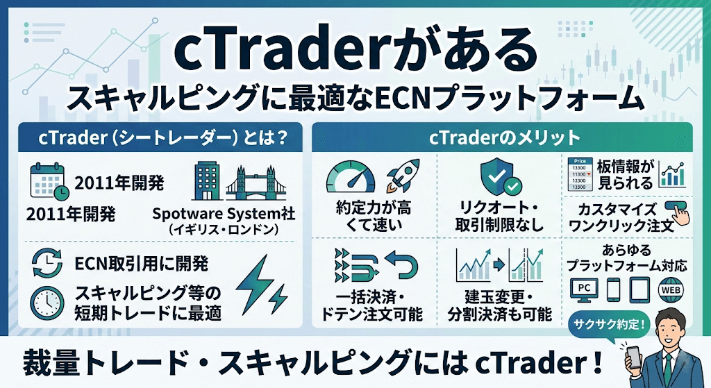 裁量トレードでスキャルピングをする場合は、サクサク約定するcTraderを使うのがおすすめです。