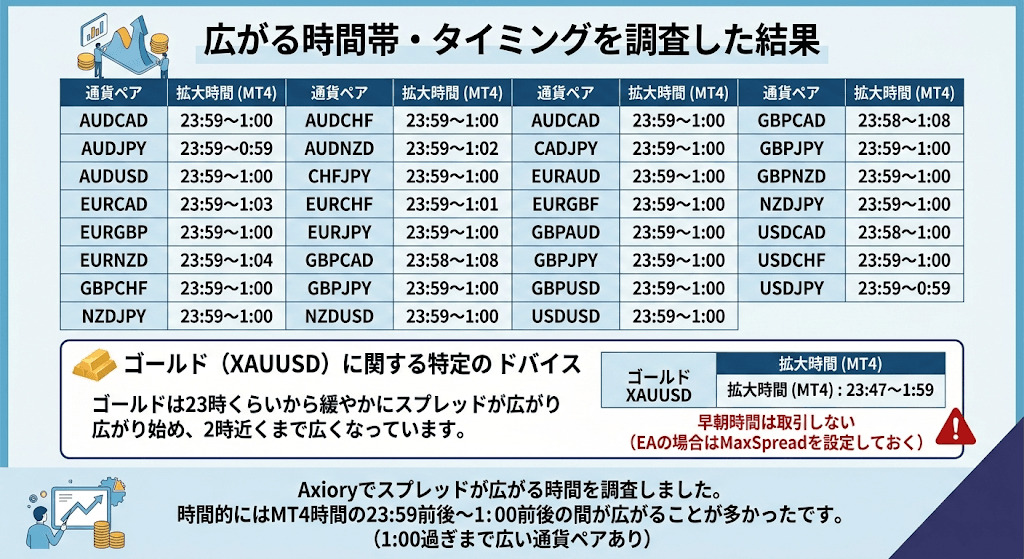 Axioryでスプレッドが広がる時間を調査しました。