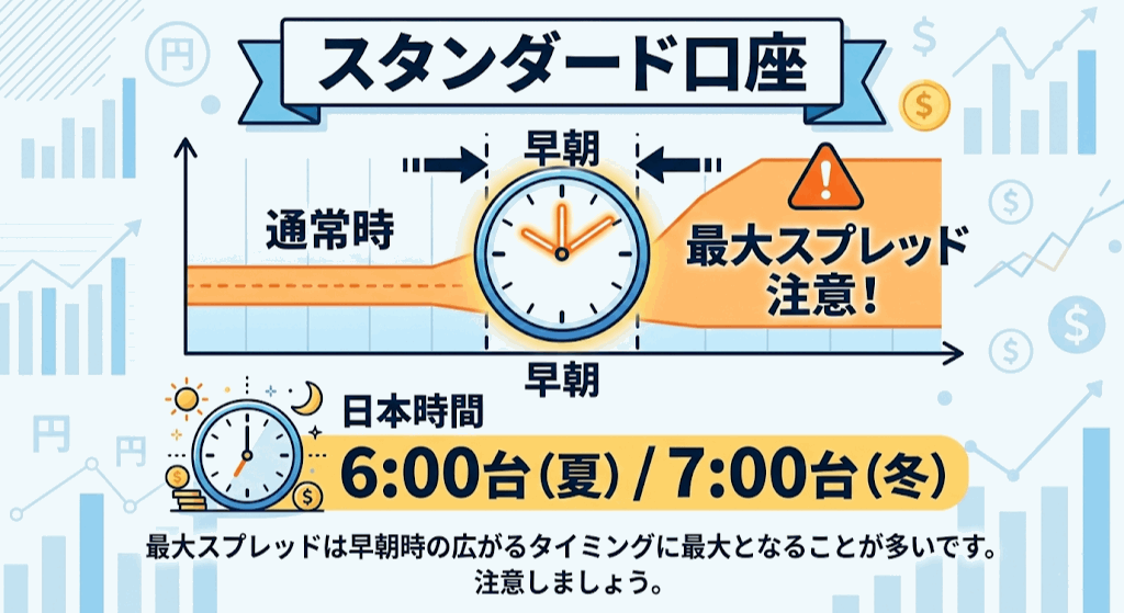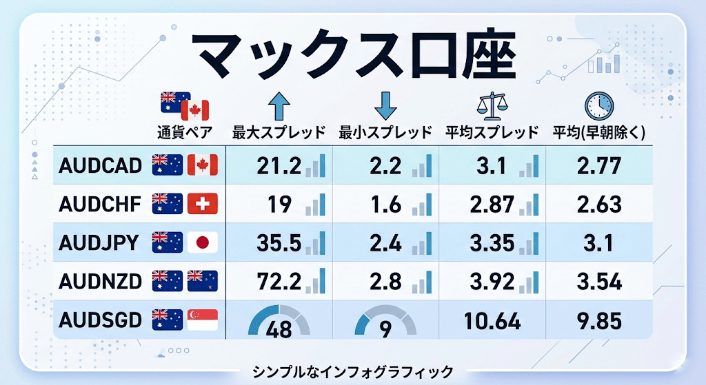 | マックス口座 | 最大スプレッド | 最小スプレッド | 平均スプレッド | 平均(早朝除く) |