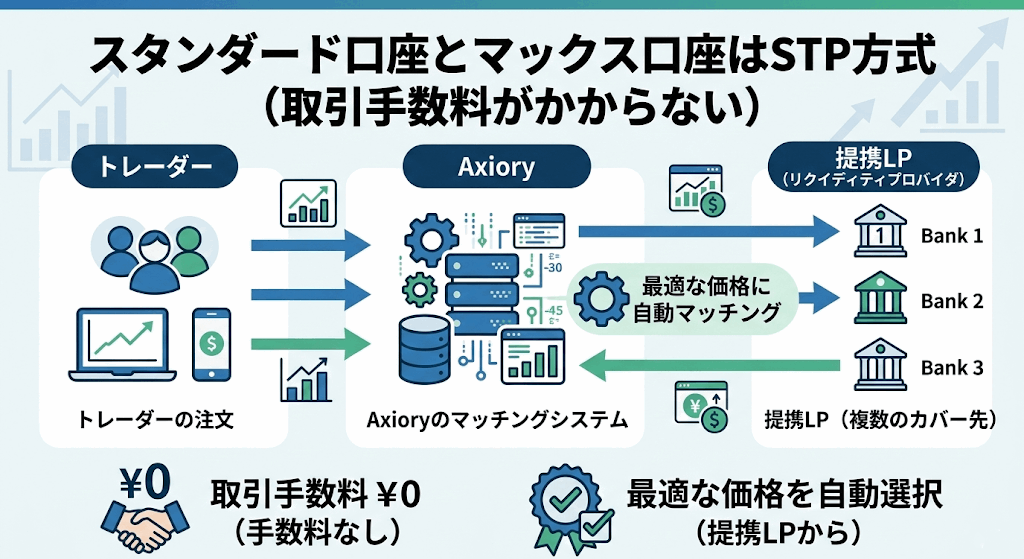 スタンダード口座とマックス口座はSTP方式(Straight Through Processing)という注文方法となり、STP方式では、トレーダーの注文をAxioryがカバー先のLP(リクイディティプロバイダ)とマッチングさせる仕組みになります。