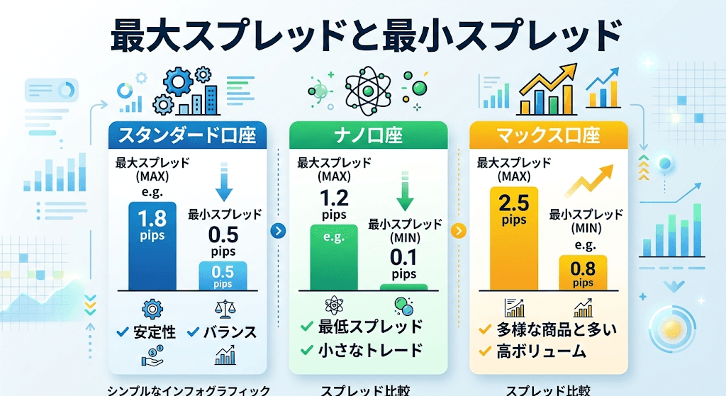 ナノ口座の最大スプレッド・最小スプレッドともにスタンダード口座よりも狭くなります。