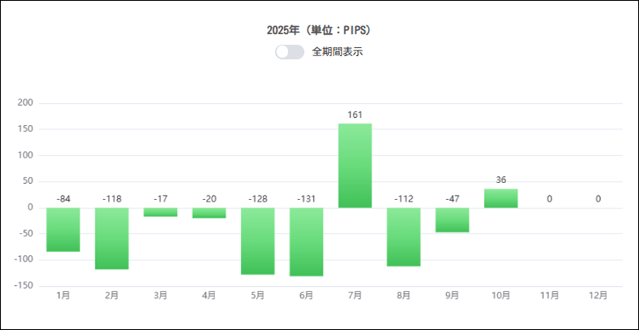 年間・月間の成績を見ると、マイナスの年もありますが、プラスの方が多めです。直近の2023年、2024年、2025年はマイナスになっています。