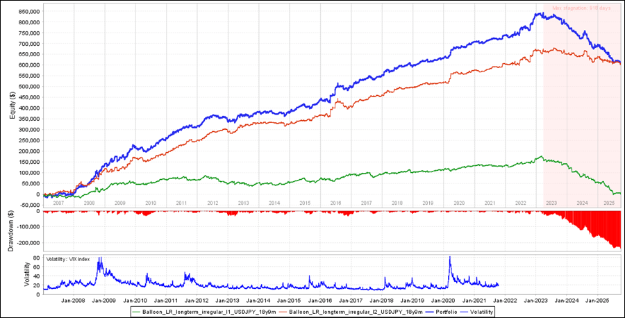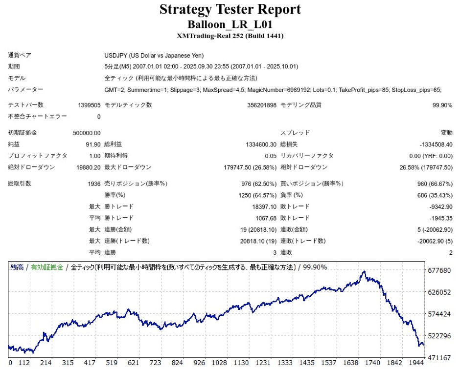 Balloon_LRのロジック1をバックテストした結果、過去18年は+91円、リリース後はマイナスの成績でした。