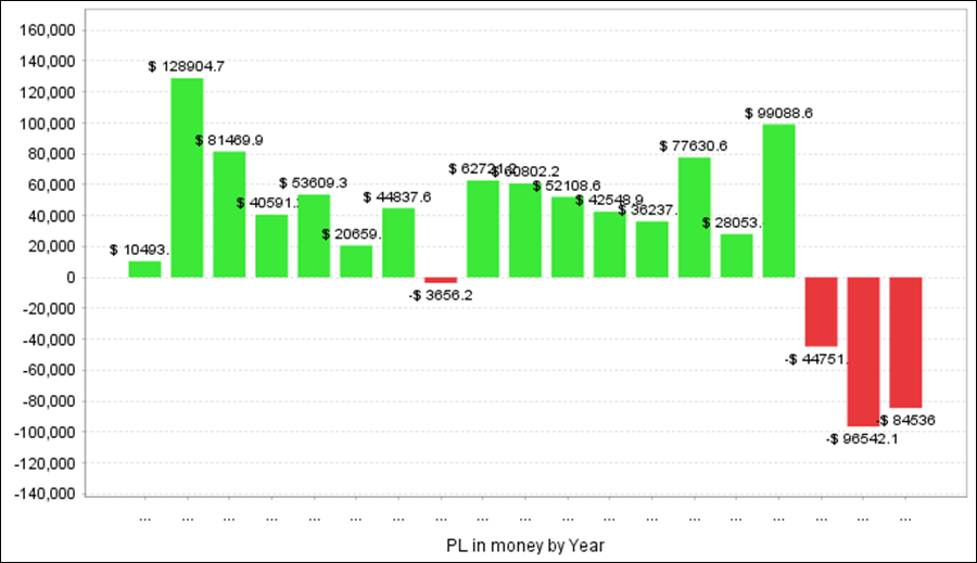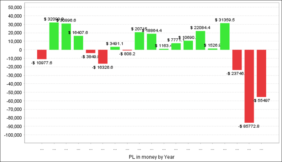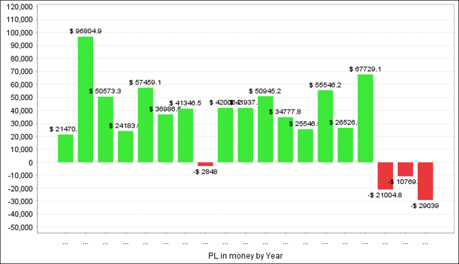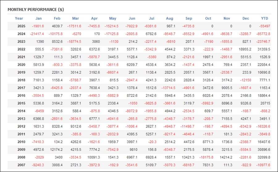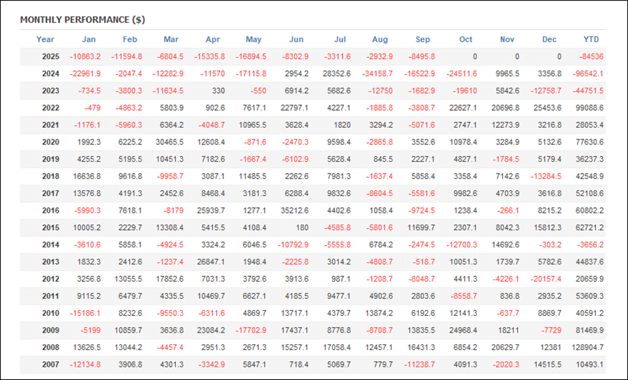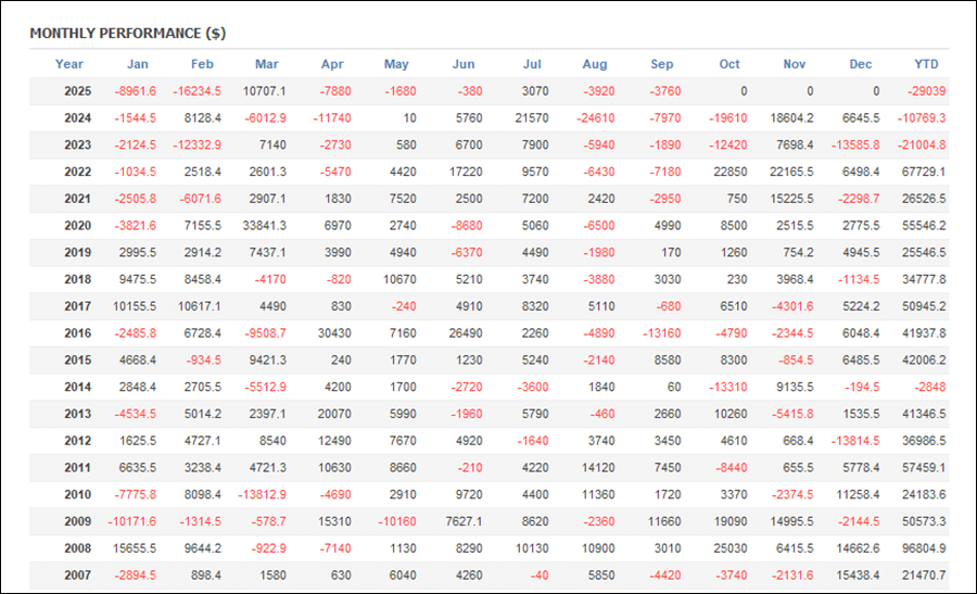 合計の年間成績では、2014年、2023年、2024年、2025年以外はプラスの成績になっています。