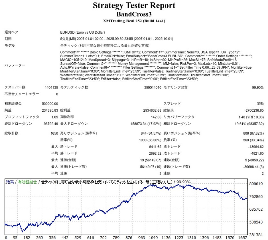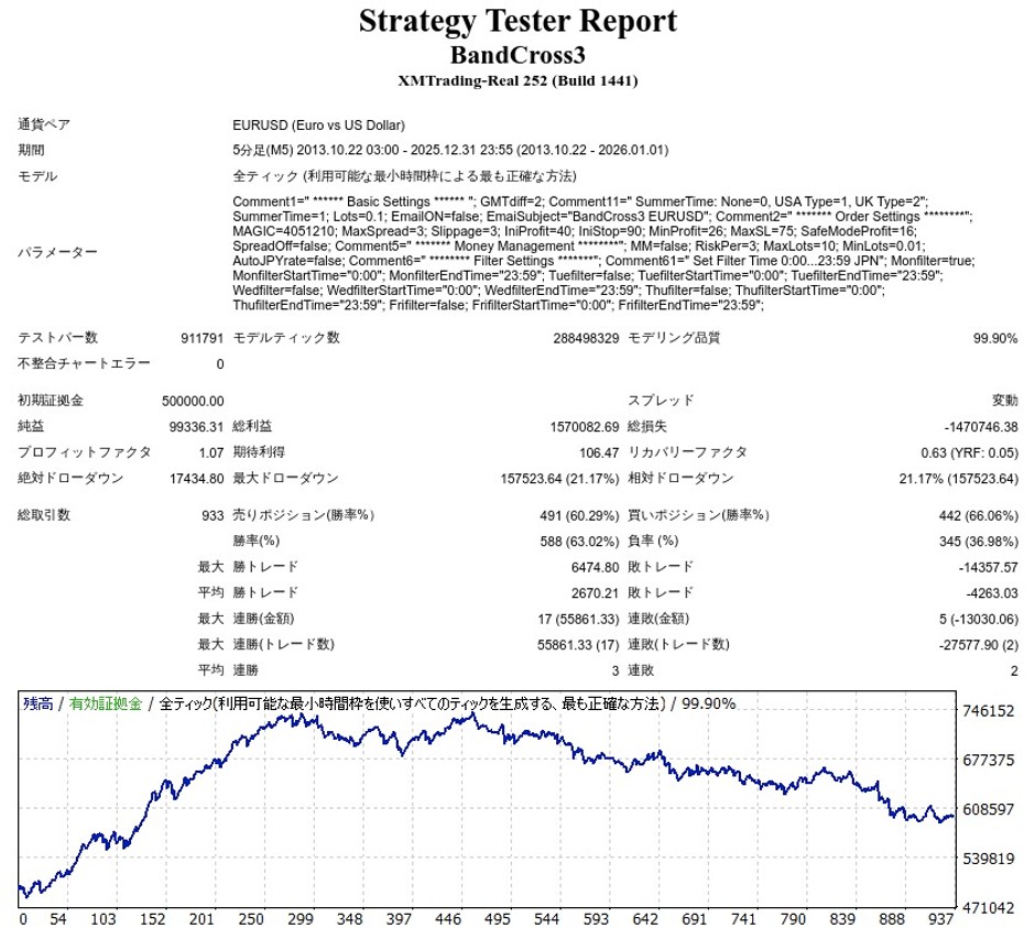 BandCross3 EURUSDのリリース後のバックテスト結果(≒フォワード結果)は以下のようになりました。