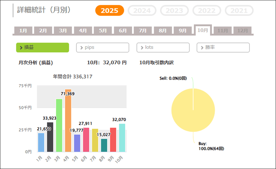 | 平均利益 | 505円 | 最大利益 | 37,050円 |
