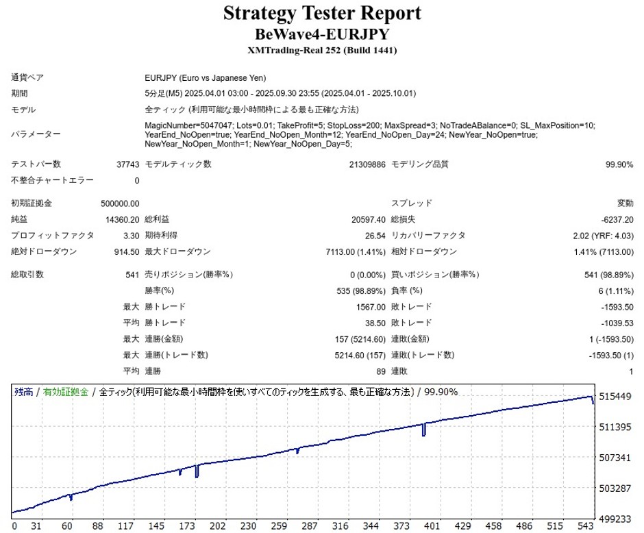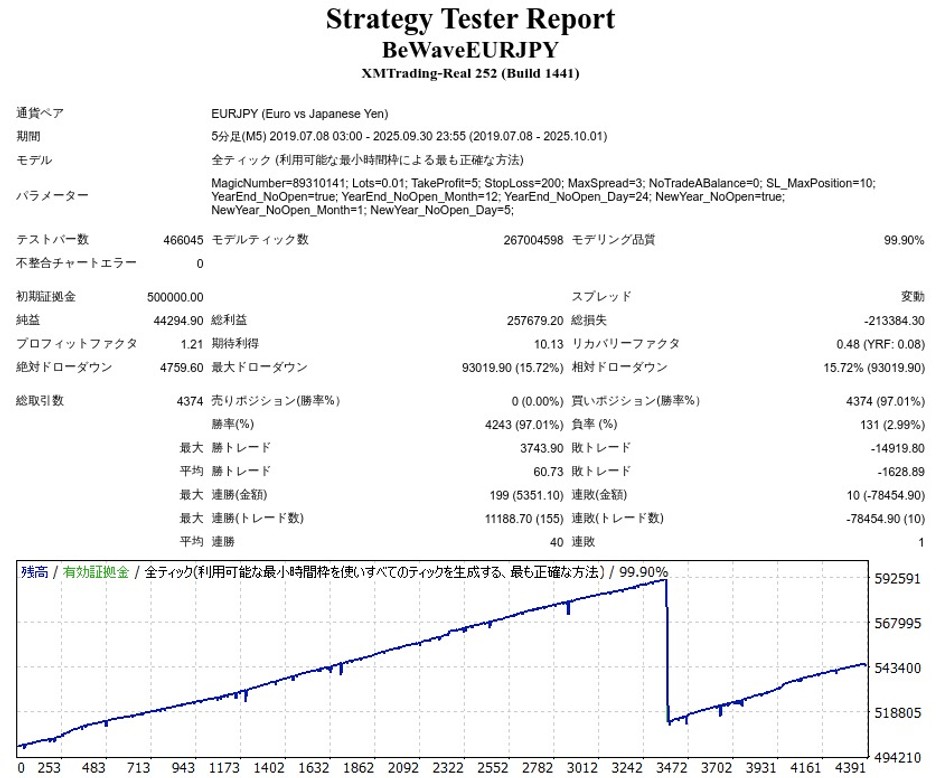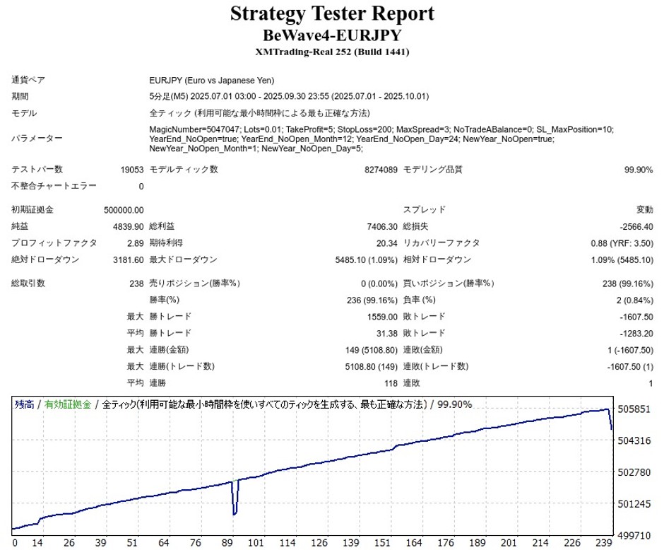 Be Wave 4 -EURJPY M5-のリリース後のバックテスト結果(≒フォワード結果)は以下のようになりました。