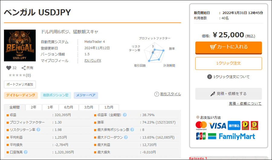 ベンガル USDJPYは公開成績を見ると、2022年1月31日リリースから順調に利益を積み重ねています。