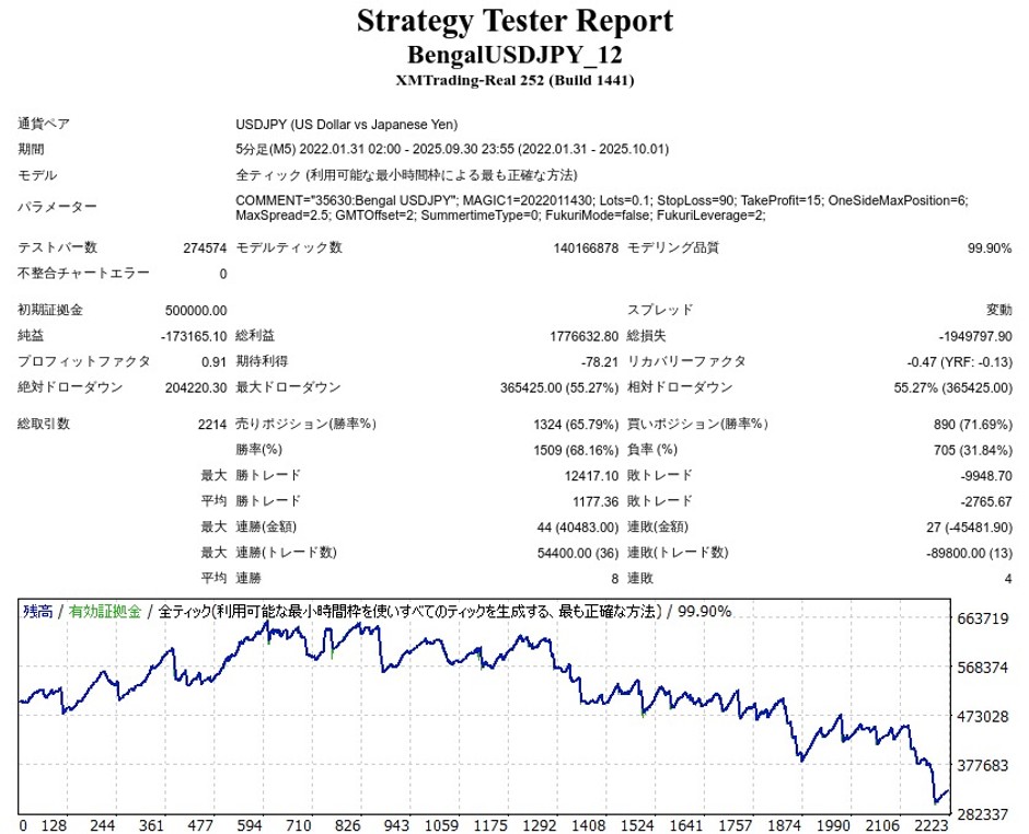 変動スプレッドON、スリッページONにして、できるだけリアルに近い環境でテストしています。
