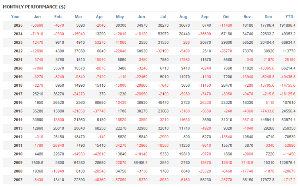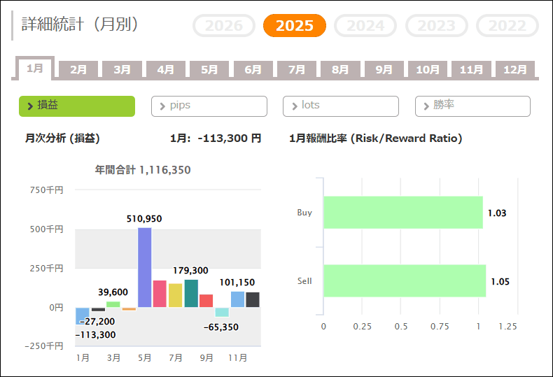 月次分析を見ると、2025年はプラスの月が多く、トータルでプラスです。2024年、2023年もトータルでプラスです。