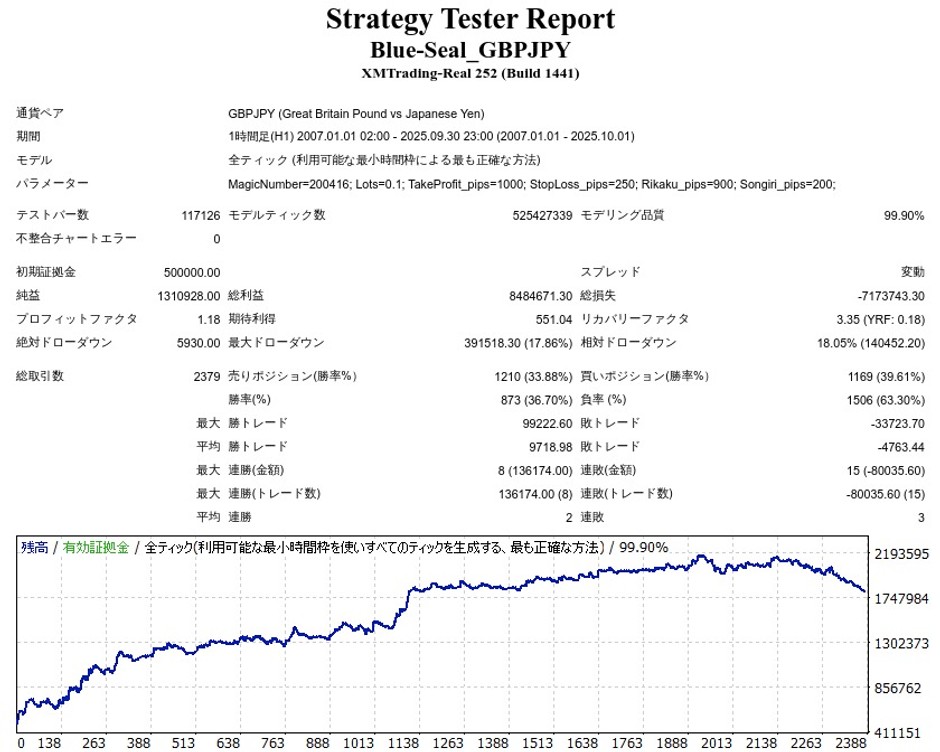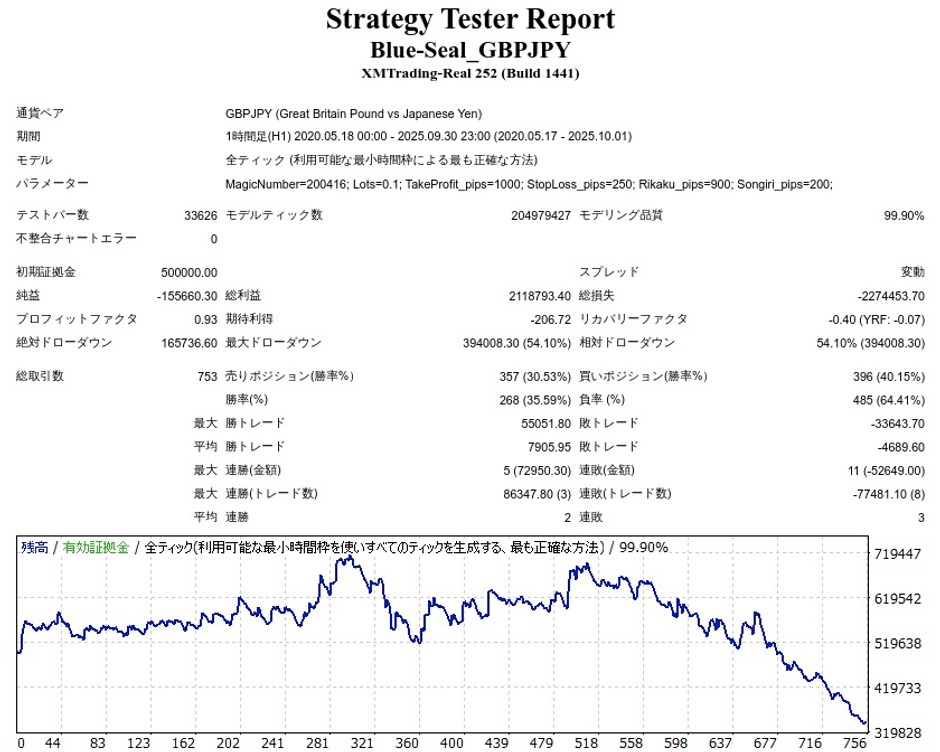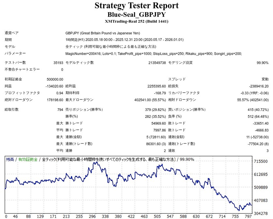 Blue-Seal GBPJPY H1は大きな利益を狙う損小利大タイプのEAですが、バックテスト結果はどうでしょうか。