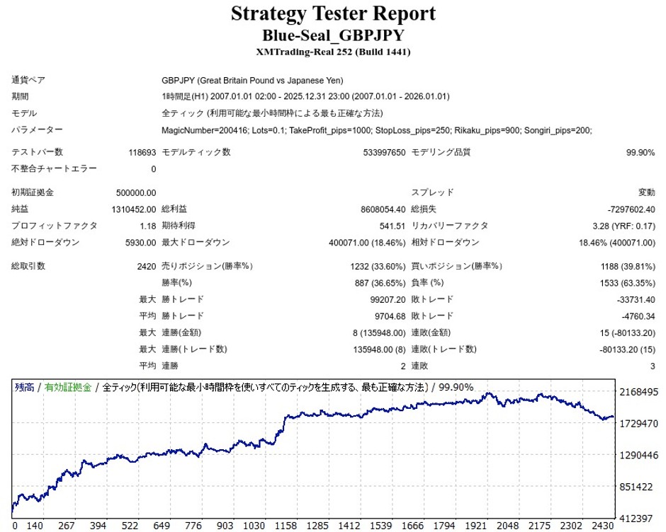 Blue-Seal GBPJPY H1の過去18年のバックテストは+131.0万円という成績でした。