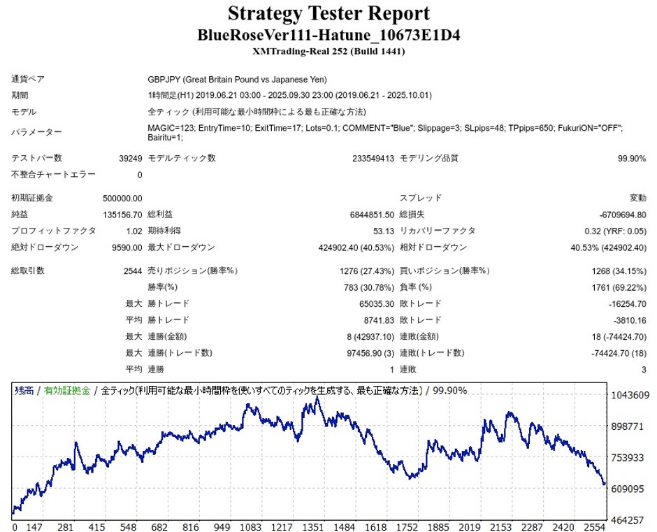 BlueRose GBP/JPYのバックテストをしてきました。過去18年、リリース後ともにプラスでした。