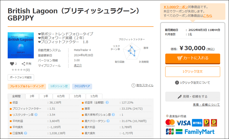 British Lagoon GBPJPYの詳細を確認する❤単ポジ・トレンドフォロータイプ   ❤長期フォワード実績(2年)     ❤プロフィットファクター 1.8 | GogoJungle
