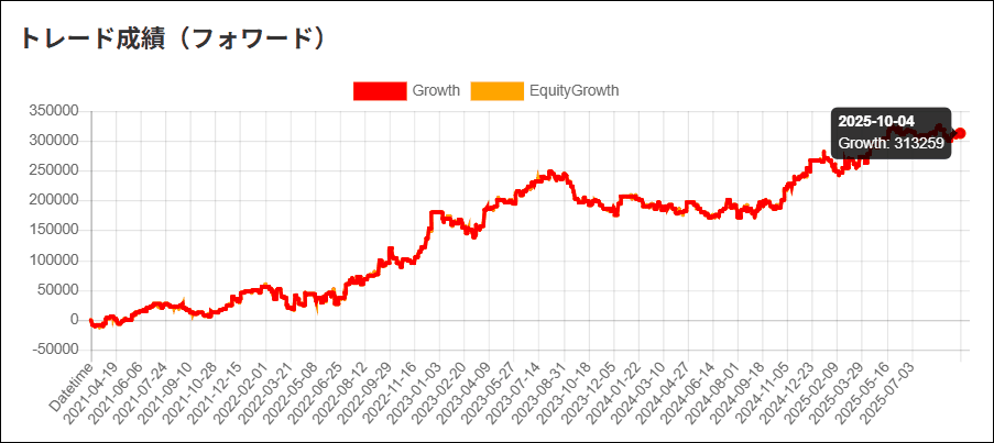 「バックテスト結果とフォワードテスト結果が違いないか」、「過去データに最適化し過ぎていないか」など参考にしてください。