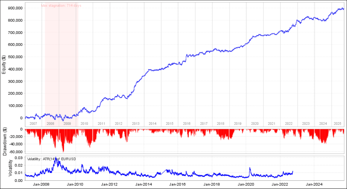 - 下方の赤色のグラフ:ドローダウン(山が大きいとドローダウンが大きい)