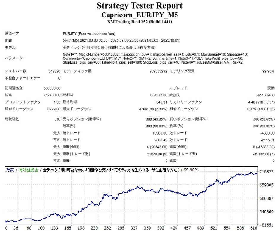 Capricorn EURJPYのリリース後のバックテスト結果(≒フォワード結果)は以下のようになりました。