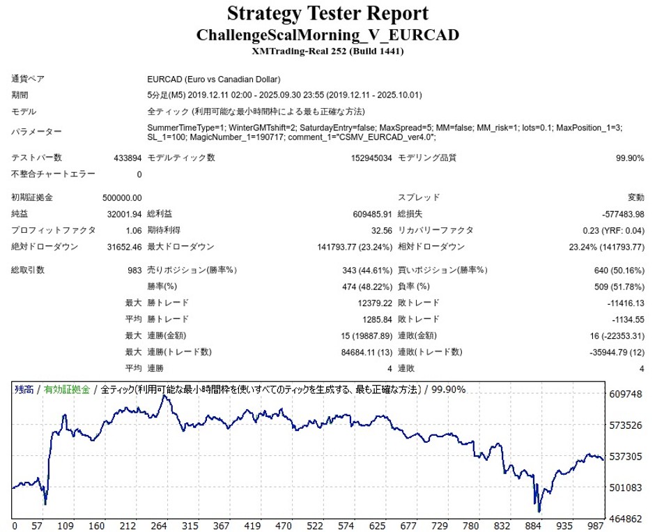 ChallengeScalMorning V EURCADのリリース後のバックテスト結果(≒フォワード結果)は以下のようになりました。