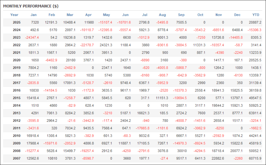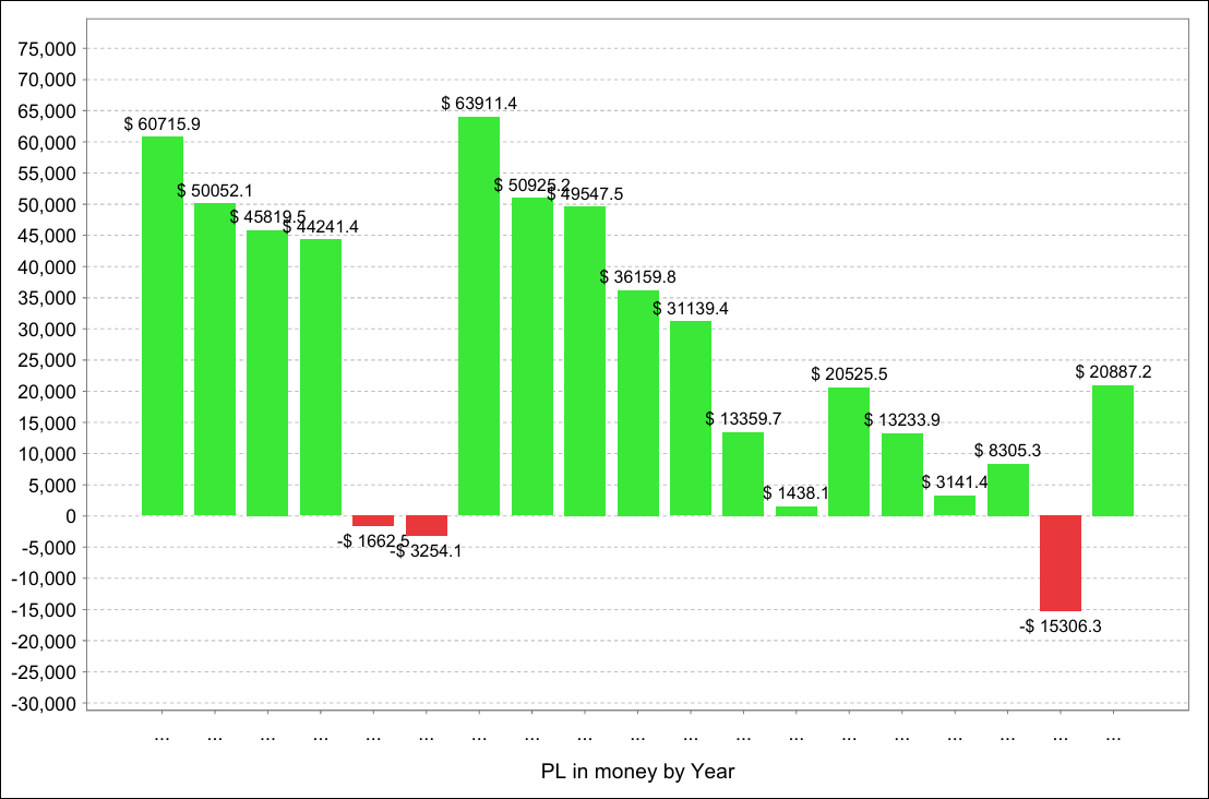 QuantAnalyzerを使った年間成績は、2011年、2012年、2024年以外はプラスの成績です。