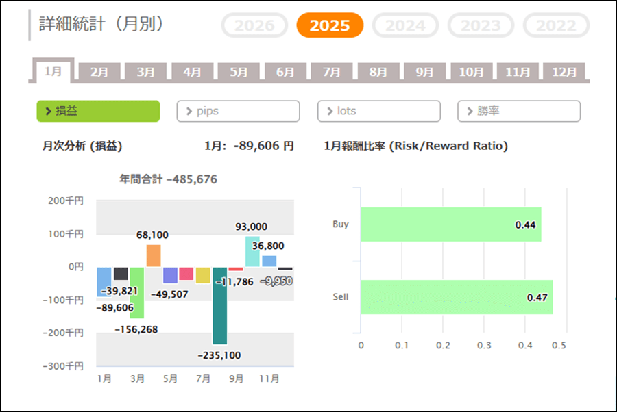 月次分析を見ると、マイナスの月もありますが、総合的にはプラスになっています。2025年はマイナスが続きトータルでマイナスです。
