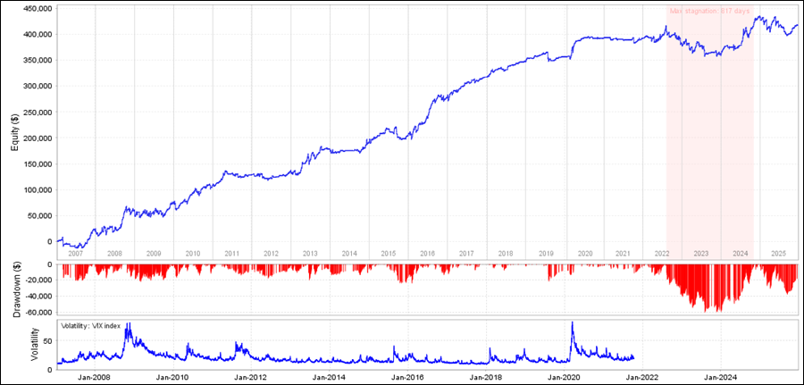 コペルニクス・ベーシックUSDJPYをQuantAnalyzerで見てみると、2023年~2024年が少し停滞しています。