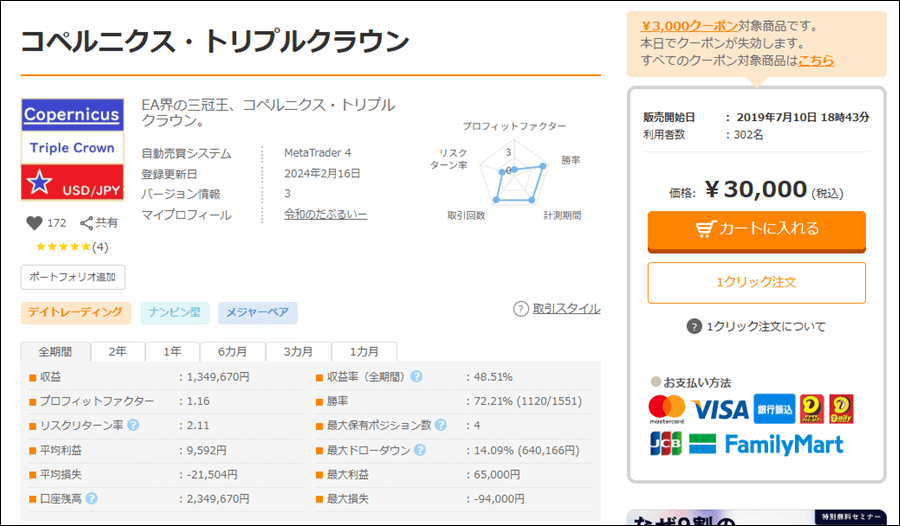コペルニクス・トリプルクラウンはUSDJPY専用のEAですが、成績はどうなのでしょうか。