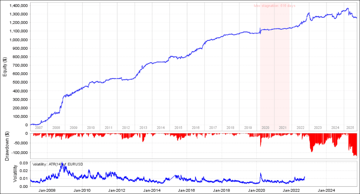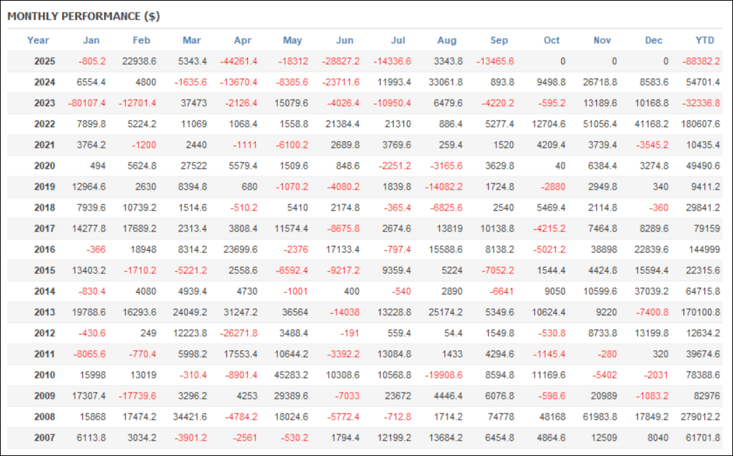 QuantAnalyzerを使った年次・月次の成績となります。マイナスだったのは2023年と2025年のみでした。