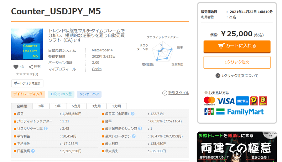 Counter_USDJPY_M5は公開成績を見ると、2021年11月22日リリースから利益を積み重ねています。