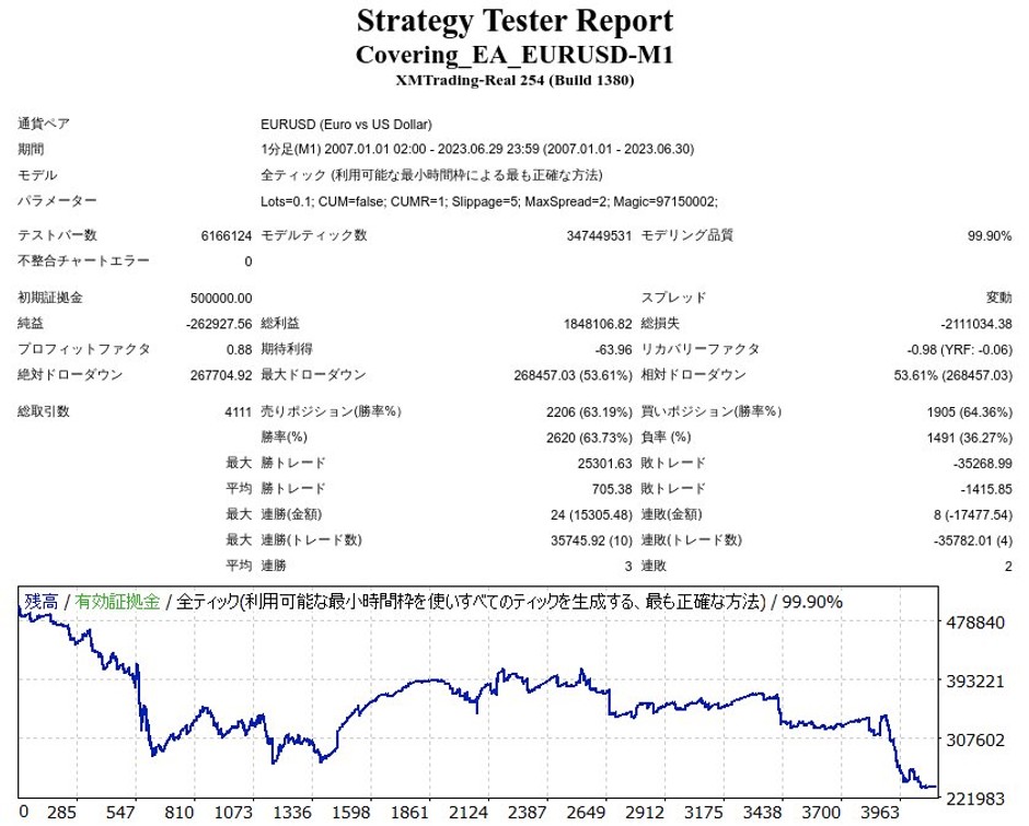 Covering_EA_EURUSDのリリース後のバックテスト結果(≒フォワード結果)は以下のようになりました。