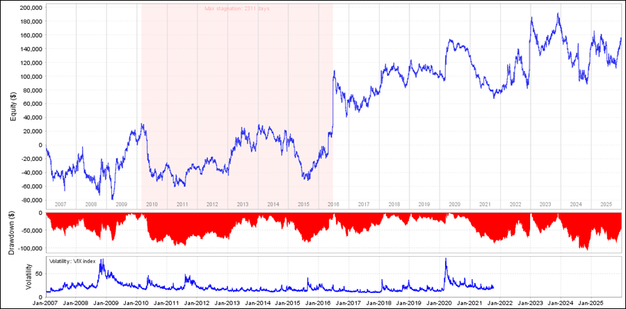 • ダイヤドル円をQuantAnalyzerで見てみると、前半は停滞していますが、後半になって成績が良くなっています。
