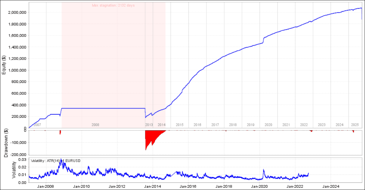 ダブリピトレードAUDNZDをQuantAnalyzerで見てみると、2008年から2014年が長く停滞しています。