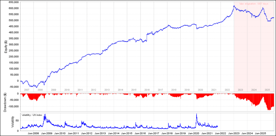 DualSystem_USDJPY_M5をQuantAnalyzerで見てみると、全体的には右肩上がりですが、直近では成績が落ちています。