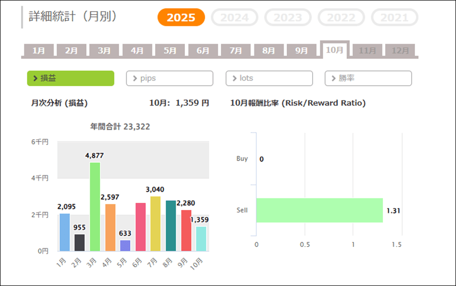 | 平均利益 | 384円 | 最大利益 | 26,588円 |