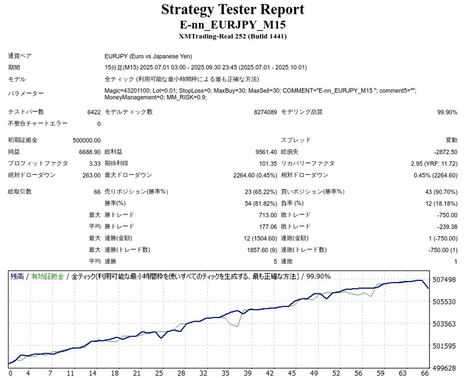 【お試しエーン】E-nn_EURJPY_M15のリリース後のバックテスト結果(≒フォワード結果)は以下のようになりました。