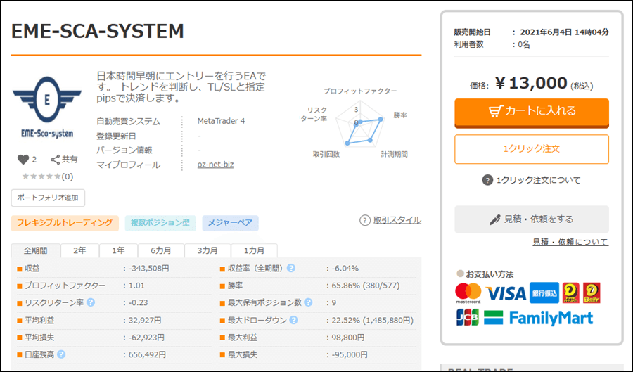 EME-SCA-SYSTEMは公開成績を見ると、2021年6月4日リリースから勝ったり負けたりで、収益はマイナスになっています。