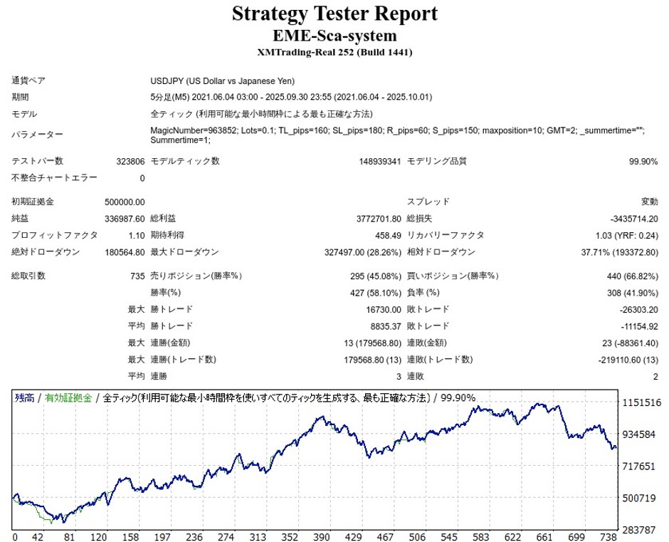 変動スプレッドON、スリッページONにして、できるだけリアルに近い環境でテストしています。
