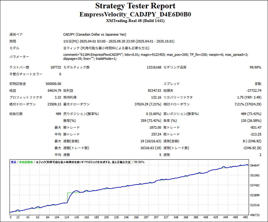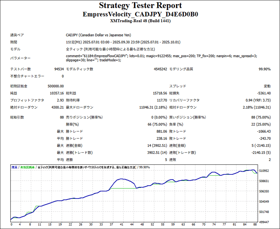 EmpressVelocity_CADJPYのリリース後のバックテスト結果(≒フォワード結果)は以下のようになりました。