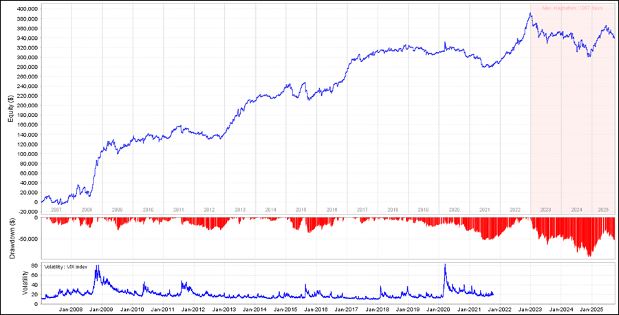 Essential_USDJPYをQuantAnalyzerで見てみると、2019年~2021年が下落していますがトータルではプラスです。