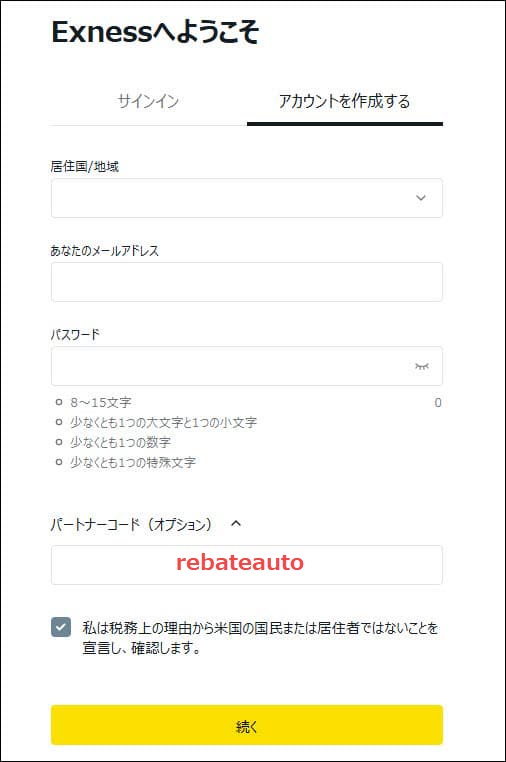 口座開設時にパートナーコードを入力する箇所があるので、パートナーコード”rebateauto”と入力します。
