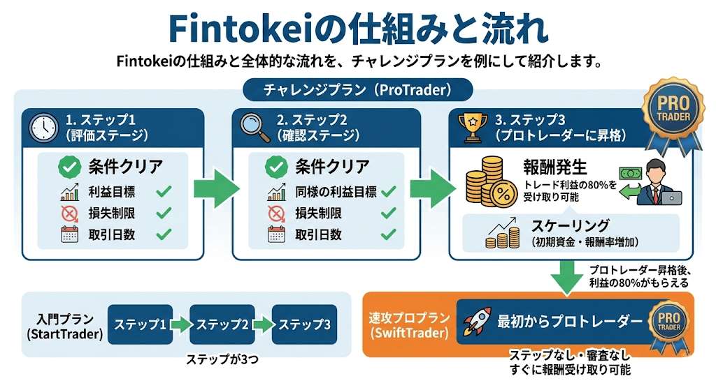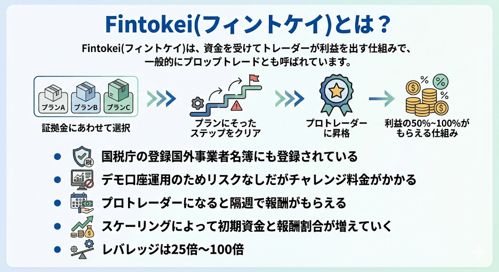 Fintokei(フィントケイ)は、資金を受けてトレーダーが利益を出す仕組みで、一般的にプロップトレードとも呼ばれています。