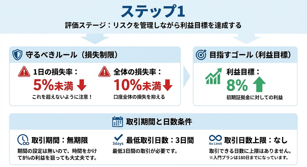 ステップ1は1日の損失率5%未満、全体の損失率10%未満に抑えながら、8%の利益を狙います。