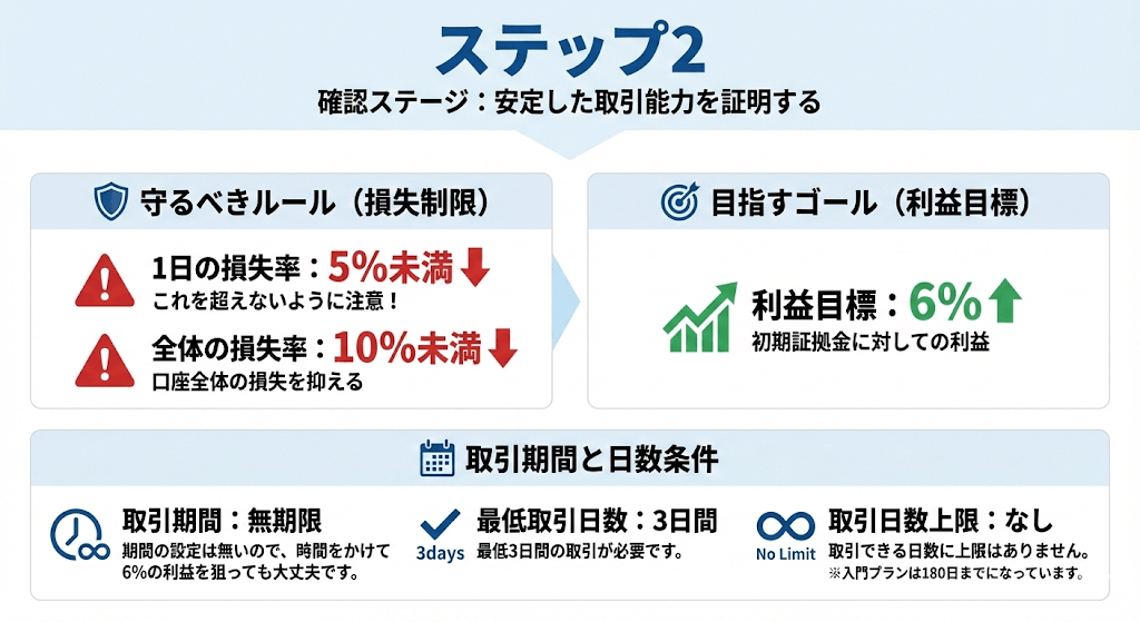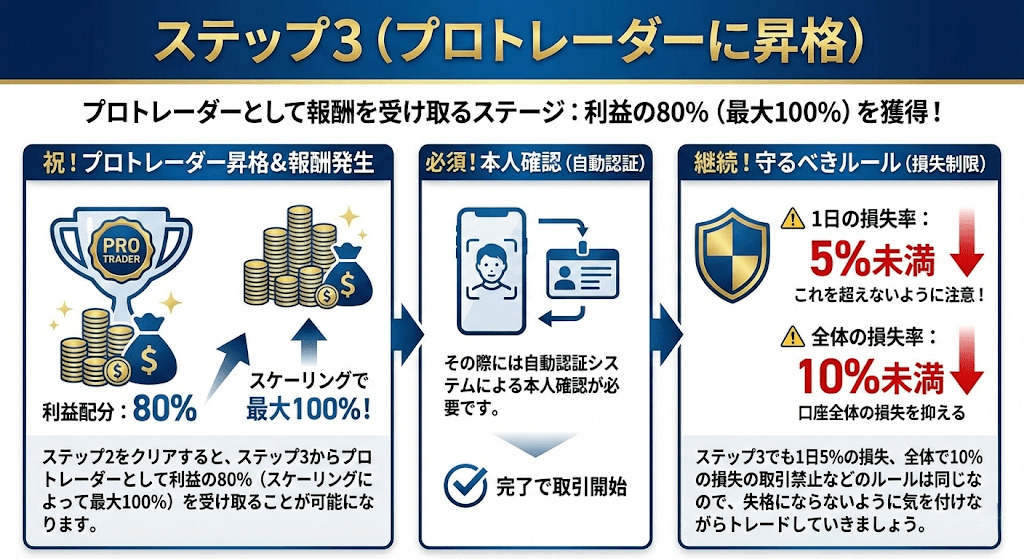ステップ3でも1日5%の損失、全体で10%の損失の取引禁止などのルールは同じなので、失格にならないように気を付けながらトレードしていきましょう。