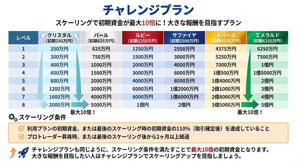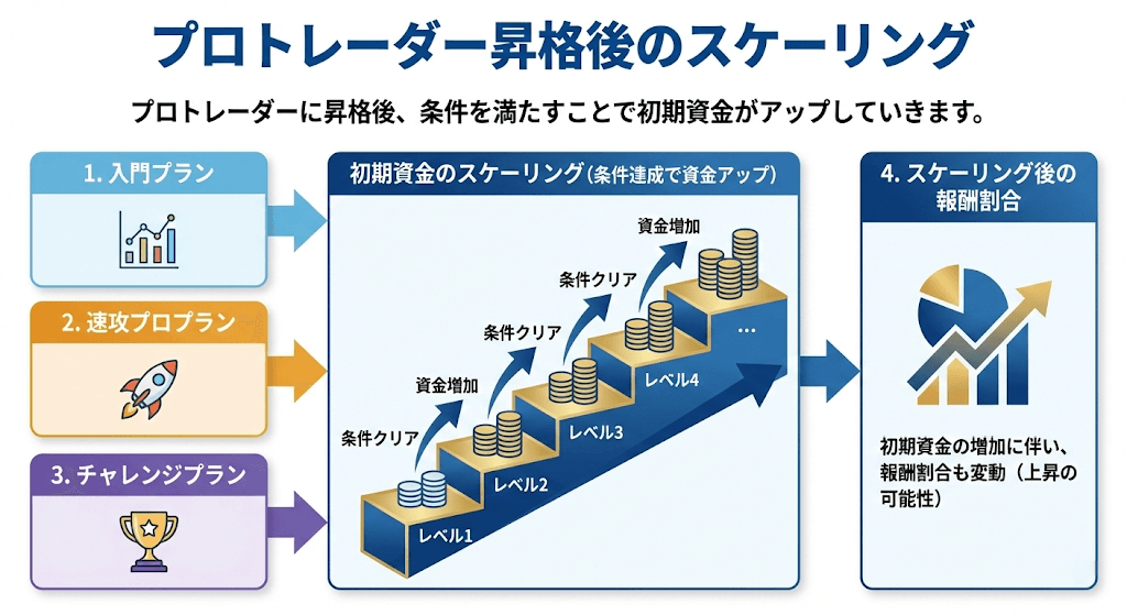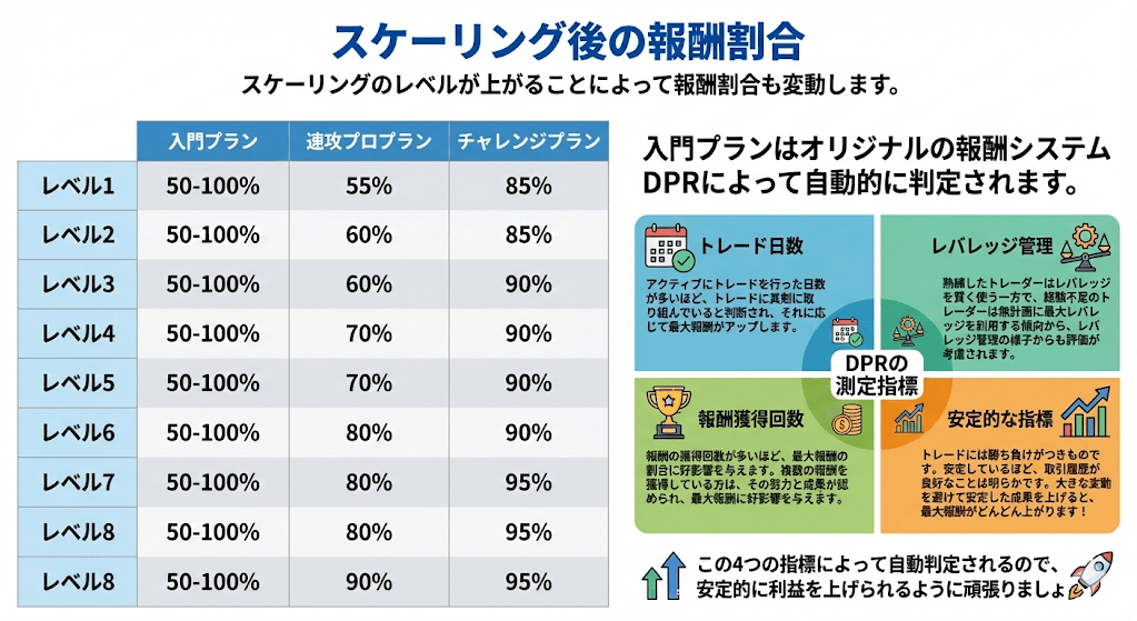 プロトレーダーに昇格すると報酬の80%(スケーリングによって最大100%)が得られるので、ぜひ挑戦してみると良いでしょう。