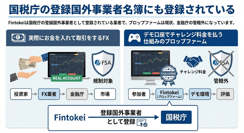 Fintokeiは国税庁の登録国外事業者として登録されている業者で、プロップファームは現状、金融庁の管轄外になっています。